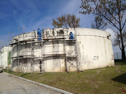 Os trabalhos em execução consistem em reparações de todas as superfícies (interiores e exteriores) do reservatório, tratamento de juntas, fissuras, juntas de dilatação, selagem de passa-muros, pintura, higienização e desinfeção bacteriológica das superfícies.